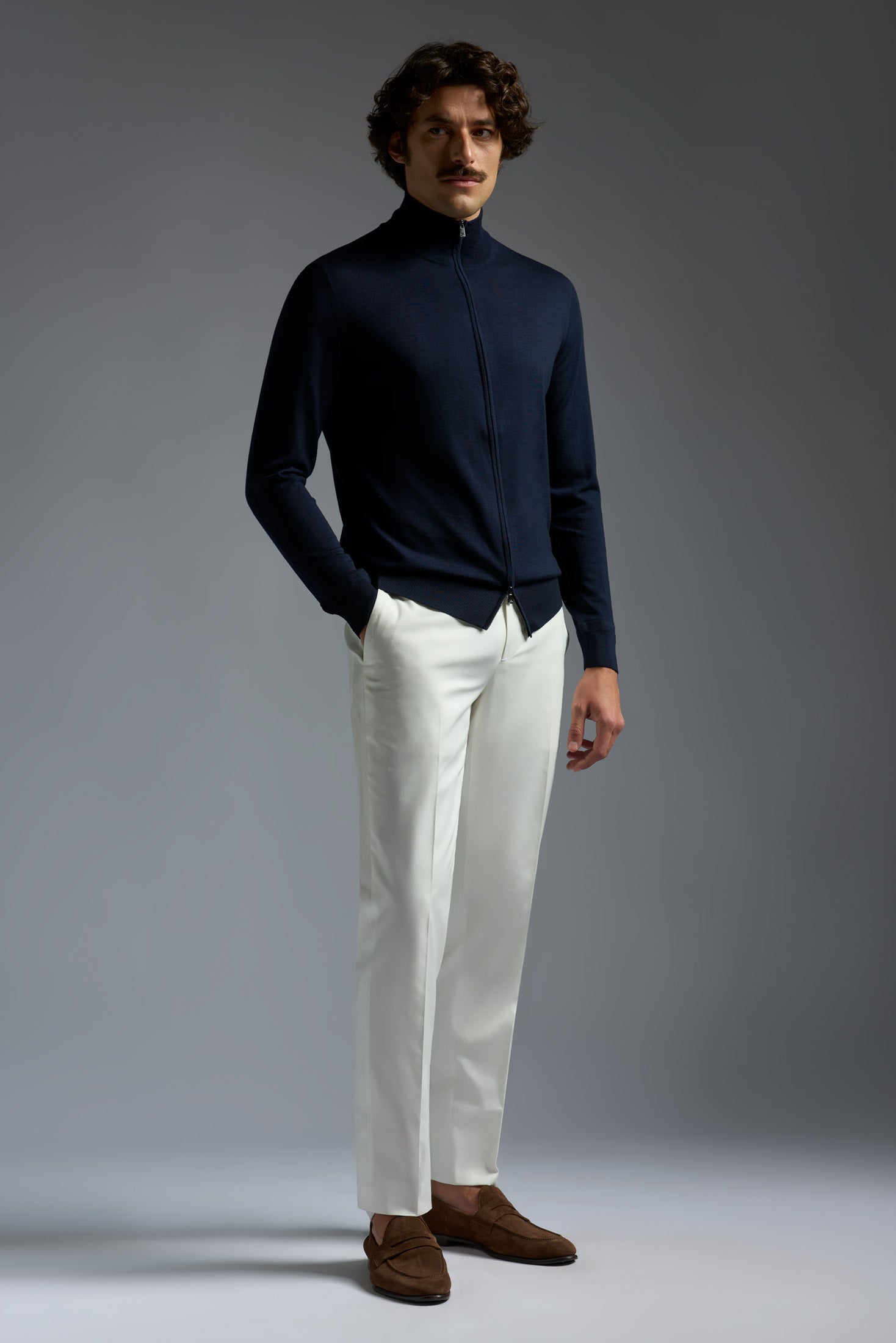 Our sporty crewneck full zip sweater signals the start of season. It has a layerable and classic look that you won't want to hide under a sport jacket.